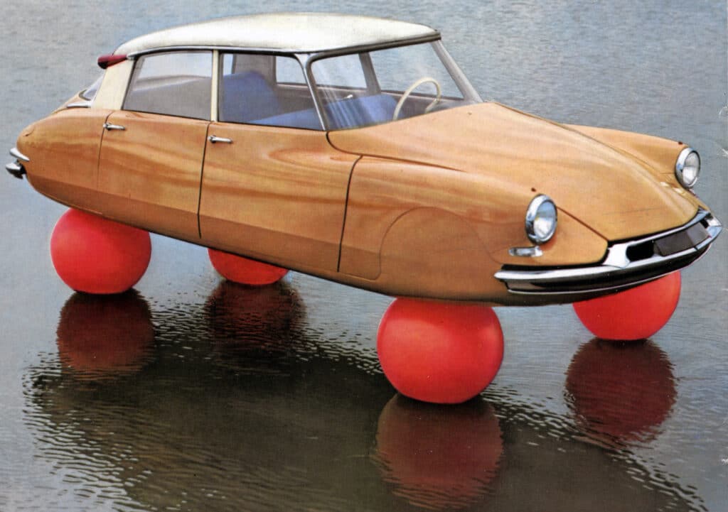 This little piece of advertising genius was an attempt to explain that the DS rode on a liquid suspension. It’s not a painting; the advertising team actually built the whole thing and anchored it in place for the photography.